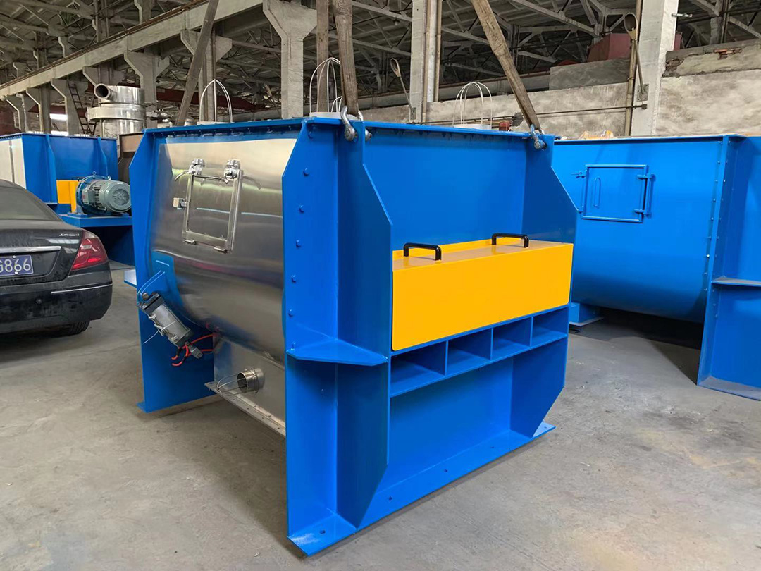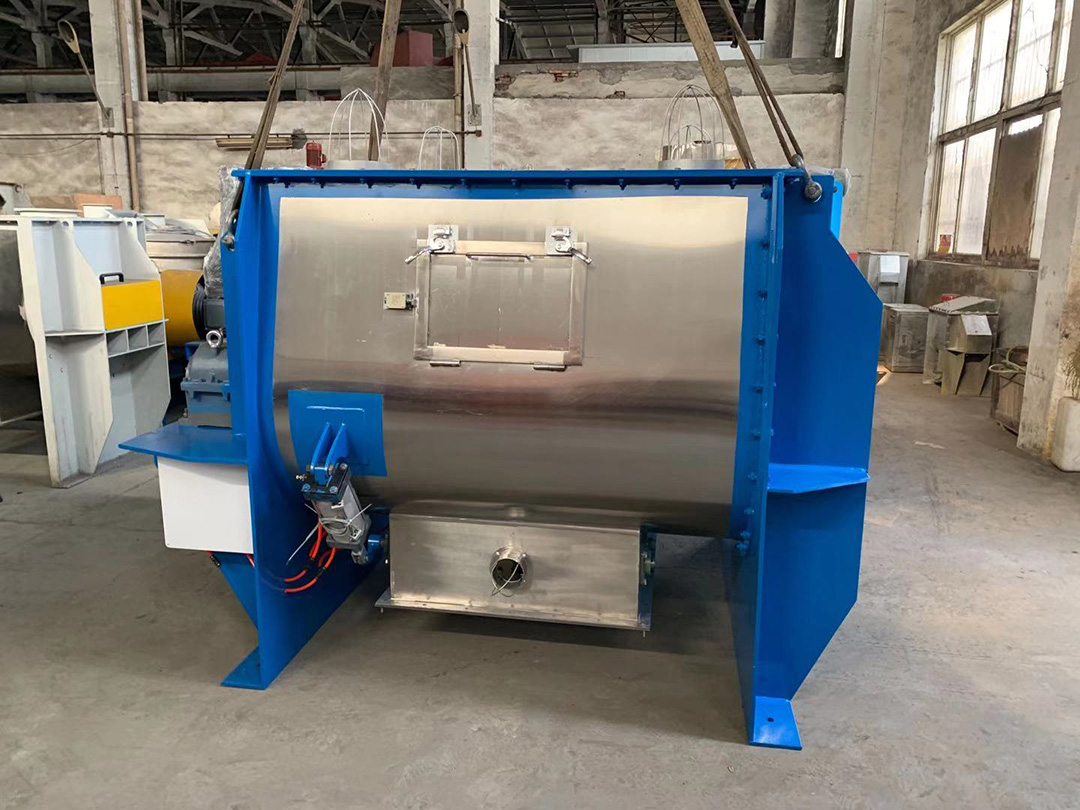該機臥式筒體內裝有雙軸旋轉反向的槳葉,槳成一定角度將物料沿軸向、徑向循環翻攪,使物料迅速混合均勻;為降低設備易損件的更換成本,槳葉葉片可做成兩片式,在葉片基座上墊一塊可移動小葉片,可直接更換磨損的小葉片,經濟快捷; 出料形式一般為氣動(手動)翻板閥,圓弧閥門緊密嵌入筒內,與筒內壁齊平,無物料堆積和混合死角現象;標準型有大開門小開門之分,大開門開口到筒邊,放料干凈快捷,殘留少。
